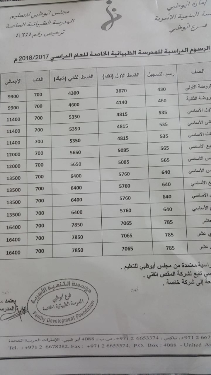 الرسوم المدرسية في مدرسة الظبيانية الاخصة للعام الدراسي 2017 2018